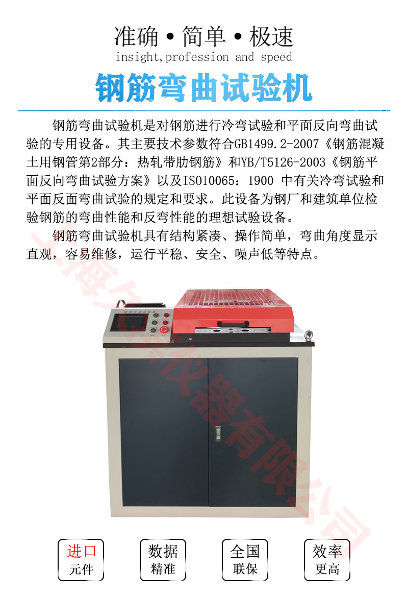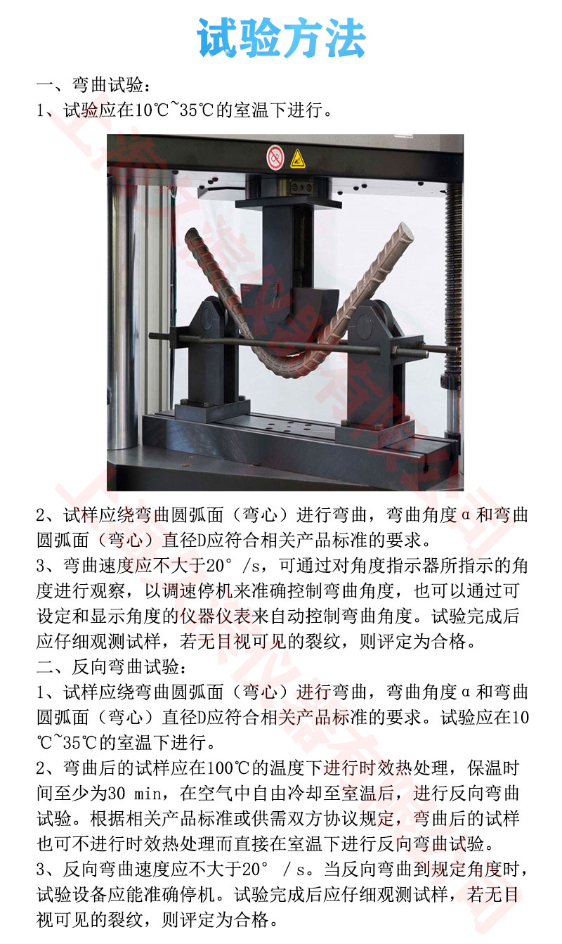 鋼筋彎曲試驗機(jī)是對鋼筋進(jìn)行冷彎試驗和平面反向彎曲試驗的專用設(shè)備。其主要技術(shù)參數(shù)符合GB1499.2-2007《鋼筋混凝土用鋼管第2部分:熱軋帶肋鋼筋》和YB/T5126-2003《鋼筋平面反向彎曲試驗方案》以及ISO10065:1900 中有關(guān)冷彎試驗和平面反面彎曲試驗的規(guī)定和要求。此設(shè)備為鋼廠和建筑單位檢驗鋼筋的彎曲性能和反彎性能的理想試驗設(shè)備。