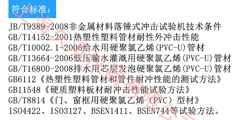 適用于PVC-U、PVC-C管、PP管、PE管、地下通信管道用塑料管等管材的耐沖擊韌性的測定。是檢測、生產(chǎn)單位、建材行業(yè)、科研單位理想的測試儀器。 符合行業(yè)標準JB/T9389落錘式?jīng)_擊試驗機技術(shù)條件,滿足GB/T14152、GB/T10002.1、GB/T13664、GB/T16800、ISO4422、ISO3127、BSEN1411、BSEN744的試驗方法。
