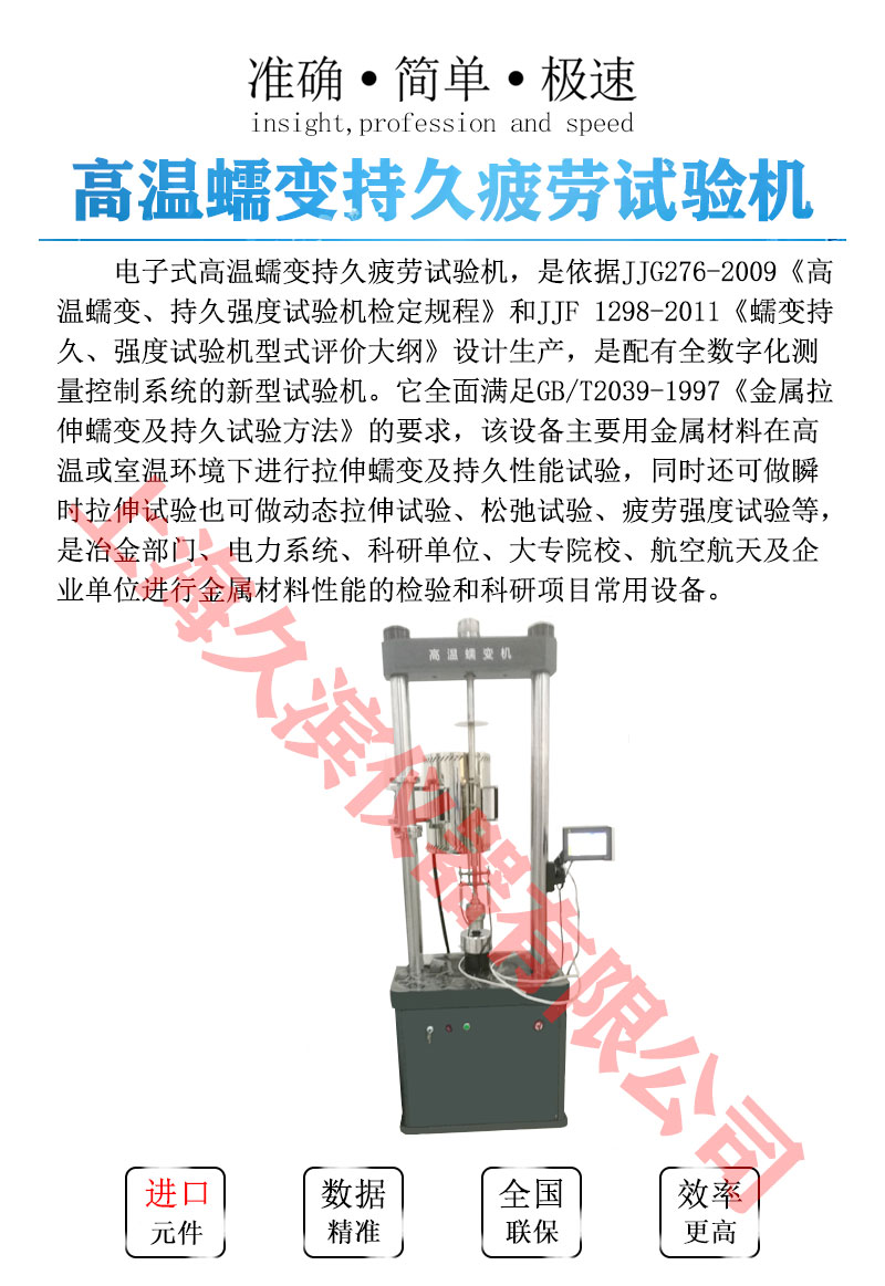 電子式蠕變及持久強度試驗機, 是依據(jù)JJG276-2009 《高溫蠕變、持久強度試驗機檢定規(guī)程》和JJF 1298-2011《蠕變持久、強度試驗機型式評價大綱》設計生產(chǎn),是配有全數(shù)字化測量控制系統(tǒng)的試驗機。它全面滿足GB/T2039-1997《金屬拉伸蠕變及持久試驗方法》的要求,該設備主要用金屬材料在高溫或室溫環(huán)境下進行拉伸蠕變及持久性能試驗,同時還可做瞬時拉伸試驗也可做動態(tài)拉伸試驗、松弛試驗、疲勞強度試驗等,是冶金部門、電力系統(tǒng)、科研單位、大專院校、航空航天及企業(yè)單位進行金屬材料性能的檢驗和科研項目常用設備。