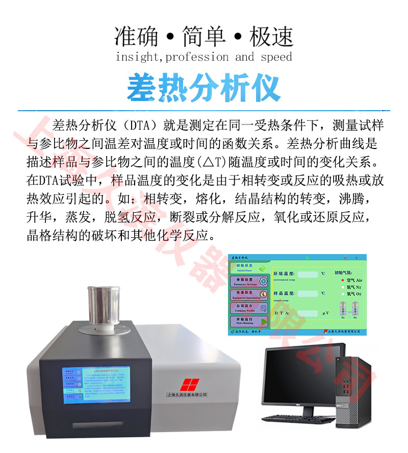 差熱分析是在程序控制溫度下,測量物質(zhì)與參比物之間的溫度差與溫度關(guān)系的一種技術(shù)。差熱分析曲線是描述樣品與參比物之間的溫度(△T)隨溫度或時間的變化關(guān)系。在DTA試驗(yàn)中,樣品溫度的變化是由于相轉(zhuǎn)變或反應(yīng)的吸熱或放熱效應(yīng)引起的。如:相轉(zhuǎn)變,熔化,結(jié)晶結(jié)構(gòu)的轉(zhuǎn)變,沸騰,升華,蒸發(fā),脫氫反應(yīng),斷裂或分解反應(yīng),氧化或還原反應(yīng),晶格結(jié)構(gòu)的破壞和其他化學(xué)反應(yīng)。