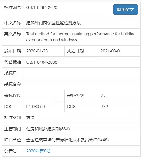 由中國建筑科學(xué)研究院有限公司修訂、全國建筑幕墻門窗標(biāo)準(zhǔn)化技術(shù)委員會(huì)歸口的國家標(biāo)準(zhǔn)GB/T 8484-2020《建筑外門窗保溫性能檢測方法》于2020年4月28日發(fā)布,2021年3月1日實(shí)施。