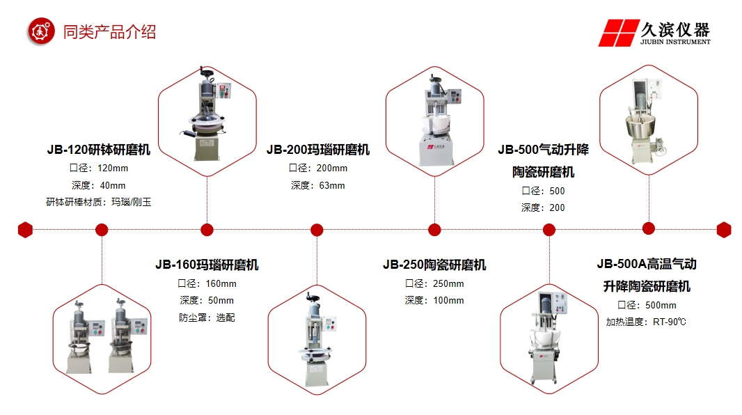 近六年來的不斷創(chuàng)新研發(fā),目前我們公司定型的研缽式研磨機(jī)產(chǎn)品主要有:JB-100型、JB-120型、JB-160型、JB-200型、JB-250型,JB-500、JB-500A型等7款機(jī)型,成為成熟的系列化產(chǎn)品,為更多的客戶能選擇到適合自身要求的研磨機(jī)。
